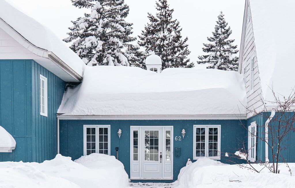 Pros and Cons of Shipping Container Building in Winter. A vertical shot of a blue house covered with white snow during winter