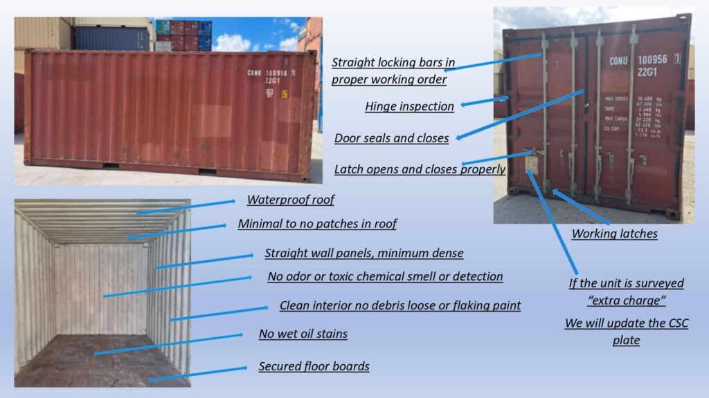 5. Containers must have at least 4 legible unit numbers, plus 4-digit ISO Code on door, a weight panel and CSC plates with current re-inspection sticker.